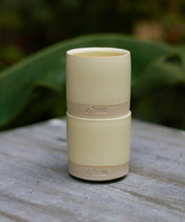 Each cup is glazed in a semi-matte light yellow, reflecting their corporate design, and features an imprinted logo stamp, carefully pressed into the clay while still in its leather-hard state.